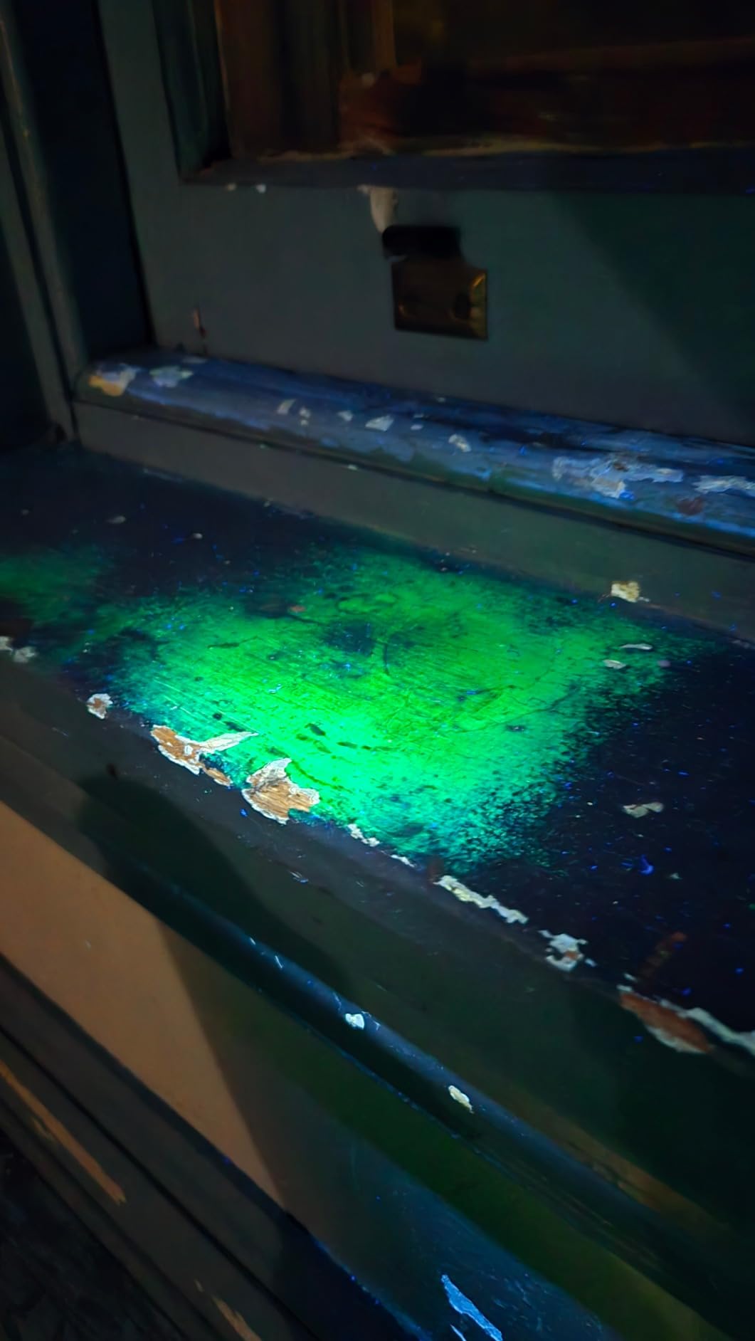 The testing liquid transforms lead into a synthetic mineral, the flashlights UV light will turn bright green so you can see where the lead is.